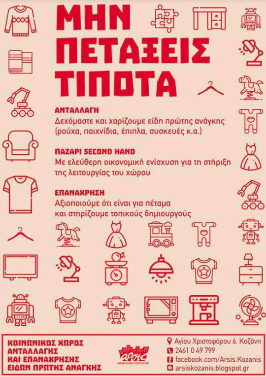 Αν πιστεύεις στις πολλαπλές ζωές των αντικειμένων, αν πιστεύεις στην κυκλική οικονομία και στη συμβολή της στην προστασία του περιβάλλοντος, αν πιάνει το χέρι σου, αν δεν πιάνει αλλά θέλεις να μάθεις, αν έχεις χρηστικά πράγματα που δεν σου είναι άλλο χρήσιμα γίνε μέλος και στήριξε την νέα ομάδα της ΑΡΣΙΣ Κοζάνης «ΔΗΜΙΟΥΡΓΙΑ & ΕΠΑΝΑΧΡΗΣΗ».