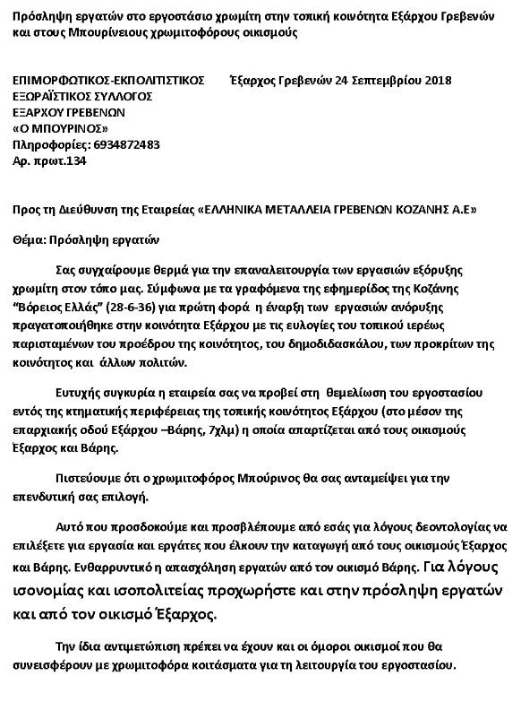Δυτική Μακεδονία 25/10/2018 Προσλήψεις εργατών στο εργοστάσιο χρωμίτη στην Τ.Κ. Εξάρχου Γρεβενών και στους Μπουρίνειους χρωμιτοφόρους οικισμούς 0 Προσλήψεις εργατών στο εργοστάσιο χρωμίτη στην Τ.Κ. Εξάρχου Γρεβενών και στους Μπουρίνειους χρωμιτοφόρους οικισμούς