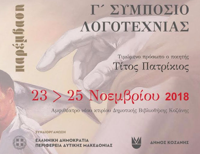 Τον Νοέμβριο θα λάβει χώρα το 3ο Συμπόσιο Λογοτεχνίας στην Κοζάνη, που διοργανώνεται από το λογοτεχνικό περιοδικό Παρέμβαση σε συνεργασία με την Περιφέρεια Δυτικής Μακεδονίας και τον Δήμο Κοζάνης. Στο Συμπόσιο συμμετέχουν η Εταιρεία συγγραφέων Ελλάδας, η Εταιρία Λογοτεχνών Θεσσαλονίκης, το Πανεπιστήμιο Δ. Μακεδονίας, το ΤΕΙ Δ. Μακεδονίας, η Αντιδημαρχία Πολιτισμού Δήμου Κοζάνης, η Κοβεντάρειος Δημοτική Βιβλιοθήκη, το ΔΗΠΕΘΕ Κοζάνης, ο Σύνδεσμος Γραμμάτων και Τεχνών Κοζάνης, ο Σύλλογος Φίλων Βιβλιοθήκης, ο Σύνδεσμος Φιλολόγων, ο Σύλλογος Βιβλιοθηκονόμων Δ. Μακεδονίας, και άλλοι φορείς των γραμμάτων και του πολιτισμού. Θα λάβουν μέρος σε αυτό άνθρωποι των γραμμάτων από τον τόπο και όλη την Ελλάδα.