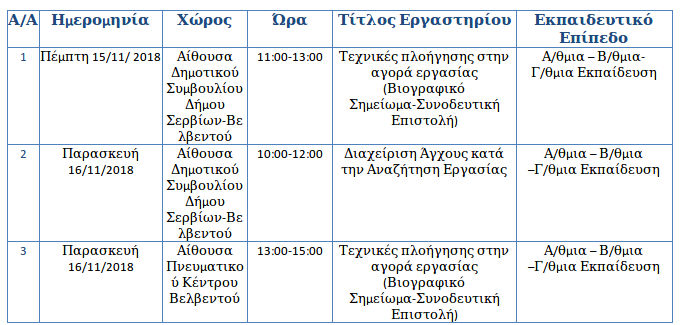 Το Δίκτυο Πληροφόρησης και Συμβουλευτικής Εργαζομένων και Ανέργων του ΙΝ.Ε. Γ.Σ.Ε.Ε. σε συνεργασία με το Κέντρο Κοινότητας του Δήμου Σερβίων -Βελβεντού θα υλοποιήσει για το μήνα Νοέμβριο ομαδικά εργαστήρια πληροφόρησης και συμβουλευτικής για ανέργους στα Σέρβια και στο Βελβεντό. Τα ομαδικά εργαστήρια παρέχονται δωρεάν και υλοποιούνται μέσω του Περιφερειακού Παραρτήματος ΙΝ.Ε. Γ.Σ.Ε.Ε. Δυτικής Μακεδονίας στην Κοζάνη με στόχο την πληρέστερη υποστήριξη για την ένταξη ή την επανένταξη ανέργων στην αγορά εργασίας.