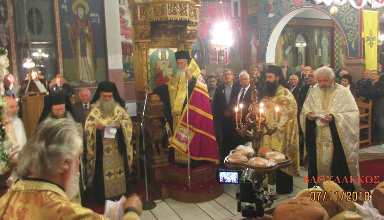 Αρχιερατικός Μέγας Εσπερινός με Αρτοκλασία και χειροθεσία πρωτοπρεσβυτέρου τελέστηκαν (7-11-2018) στην ιερά πανήγυρη του Ιερού Ενοριακού Ναού Ταξιάρχη Μιχαήλ Βαθυλάκκου. Ακολούθησε ανήμερα της εορτής η Θεία Λειτουργία.