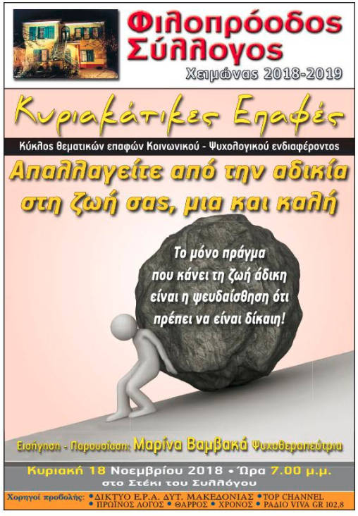 Το θέμα της πρώτης εισήγησης «Απαλλαγείτε από την αδικία στη ζωή σας, μια και καλή», επιμελείται η ψυχοθεραπεύτρια Μαρίνα Βαμβακά.