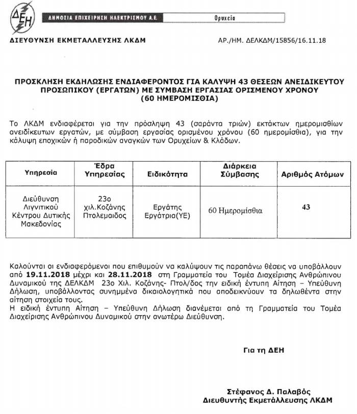 Κοζάνη 16/11/2018 Λιγνιτικό Κέντρο Δυτικής Μακεδονίας: 43 θέσεις στα 2μηνα της ΔΕΗ 0 Λιγνιτικό Κέντρο Δυτικής Μακεδονίας: 43 θέσεις στα 2μηνα της ΔΕΗ. Κλικ εδώ για περισσότερα