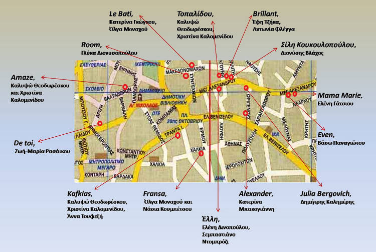 Ακολουθούμε το στενό απέναντι και μέσα από την οδό Συντεχνιών βγαίνουμε στην Μεγάλου Αλεξάνδρου και στρίβουμε αριστερά. Λίγο μετά, στο δεξί μας χέρι συναντάμε το κατάστημα Έλλη. Εδώ, η απόφοιτη εικαστικός Ελένη Δινοπούλου συνομιλεί με τον γλύπτη Σεμπαστιάνο Ντομπρόζι. Στο πρώτο επίπεδο της βιτρίνας στέκει το γλυπτό κορμί μιας γυμνής γυναικείας φιγούρας που συστρέφει το σώμα σαν να θέλει να κοιτάξει πίσω της. Εκεί βρίσκονται οι ακουαρέλες της Ελένης Δινοπούλου, σαν φωτογραφική αποτύπωση της σάρκας μιας γυναίκας, που από ανέμελη και ποθητή, καταλήγει κλειδωμένη.