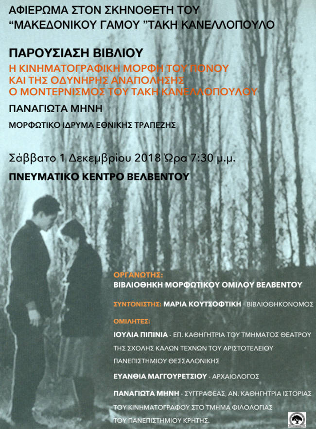 Η Βιβλιοθήκη του Μορφωτικού Ομίλου Βελβεντού διοργανώνει εκδήλωση παρουσίασης του βιβλίου της Παναγιώτας Μήνη «Η κινηματογραφική μορφή του πόνου και της οδυνηρής αναπόλησης. Ο μοντερνισμός του Τάκη Κανελλόπουλου».