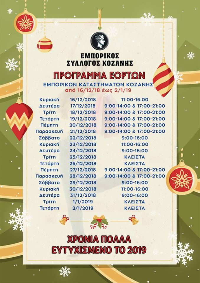 Κοζάνη 29/11/2018 Αυτό είναι το Χριστουγεννιάτικο εορταστικό ωράριο του Εμπορικού Συλλόγου Κοζάνης 0 Ο Εμπορικός Σύλλογος Κοζάνης ανακοινώνει στο καταναλωτικό κοινό, στους ελεύθερους επαγγελματίες αλλά και στους ιδιωτικούς υπαλλήλους, το χριστουγεννιάτικο εορταστικό ωράριο. Καλά Χριστούγεννα σε όλους!