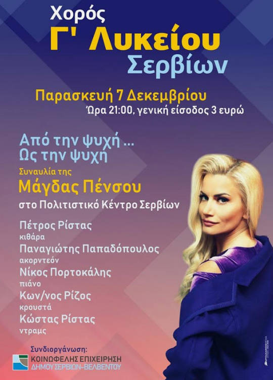 Η Γ΄Λυκείου Σερβίων διοργανώνει συναυλία την Παρασκευή 7 Δεκεμβρίου και ώρα 21:00΄στο Πολιτιστικό Κέντρο Σερβίων με την Μάγδα Πένσου και γενική είσοδο 3 ευρώ.