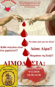 Η 38η Αιμοδοσία του 2018 διοργανώνεται στο Πρωτοχώρι την Κυριακή 9 Δεκεμβρίου 2018 από τις 10:30 – 14:30, (προσέλευση μέχρι 14:00), στον χώρο του Πολιτιστικού Συλλόγου σε Συνδιοργάνωση με τους Τοπικούς φορείς Πρωτοχωρίου