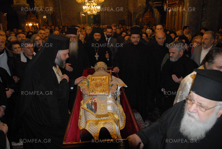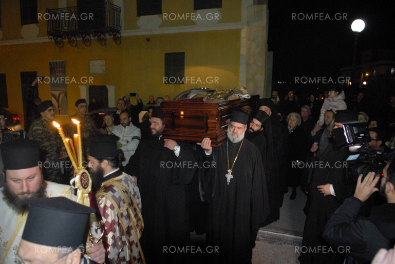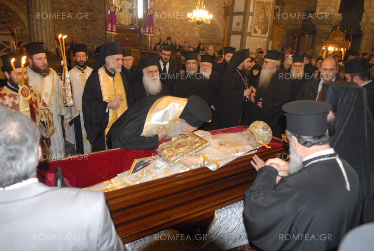 Το ιερό Σκήνωμα υποδέχθηκε, με τις αρμόζουσες εκκλησιαστικές και στρατιωτικές Τιμές, ο οικείος Ποιμενάρχης, φίλος και καρδιακός αδελφός του μακαριστού Ιεράρχου, Μητροπολίτης Χαλκίδος κ. Χρυσόστομος, ενώ συμμετείχαν και οι Σεβασμιώτατοι Μητροπολίτες Νέας Σμύρνης κ. Συμεών και Κορίνθου κ. Διονύσιος, με τον οποίον ο μακαριστός συνυπηρέτησαν στην Ι. Μητρόπολη Χαλκίδος.