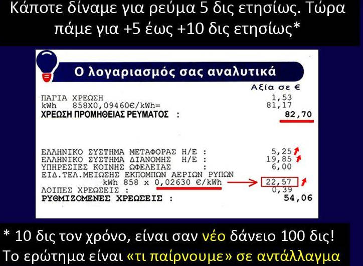 Και μαζί του πρέπει να καταργηθούν όλες οι «ρυθμιζόμενες χρεώσεις» γιατί επιβαρύνουν δυσβάσταχτα τον φτωχομεσαίο καταναλωτή ηλεκτρικής Ενέργειας (διπλασιάζουν τον λογαριασμό ρεύματος) και δεν είναι «ανταποδοτικές». Για ποιο λόχο πχ να πληρώνουμε ΥΚΩ (Υπηρεσίες Κοινής Ωφέλειας); Δεν είναι υποχρέωση του Κράτους η άσκηση κοινωνική πολιτικής; Και γιατί πρέπει να πληρώνουμε έξω από την τιμή του ρεύματος τα δίκτυα και τις άλλες ρυθμιζόμενες χρεώσεις;