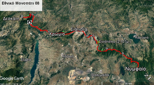 Μετά το χωριό Χρώμιο επιλέχθηκε ο χωματόδρομος προς τη μονή της Ζάβορδας αφού η κατεύθυνση του έχει πάντα νότιο προσανατολισμό. Η θέα της καινούργιας τεχνητής λίμνης σε όλη τη διάρκεια της πορείας αποζημιώνει τον ταξιδιώτη. Το ίδιο ισχύει και για το τμήμα Ζάβορδα-Παλιουριά που είναι κατά κύριο λόγο ασφάλτινο με κορυφαία στιγμή τη διέλευση της γέφυρας στον ποταμό Αλιάκμονα η οποία αλλάζει τη διάθεση του περιπατητή. Τελευταίο κομμάτι του 08 είναι η ανάβαση στα Καμβούνια προς το καταφύγιο του Ορειβατικού Συλλόγου Δεσκάτης στη Βουνάσα με τερματισμό στη Δεσκάτη.