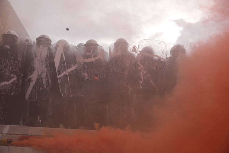 Οι αστυνομικοί πέταξαν χημικά για να διαλύσουν τη συγκέντρωση έξω από τη Βουλή – Άγνωστοι διαδηλωτές πέταξαν κόκκινες και άσπρες μπογιές στα ΜΑΤ.