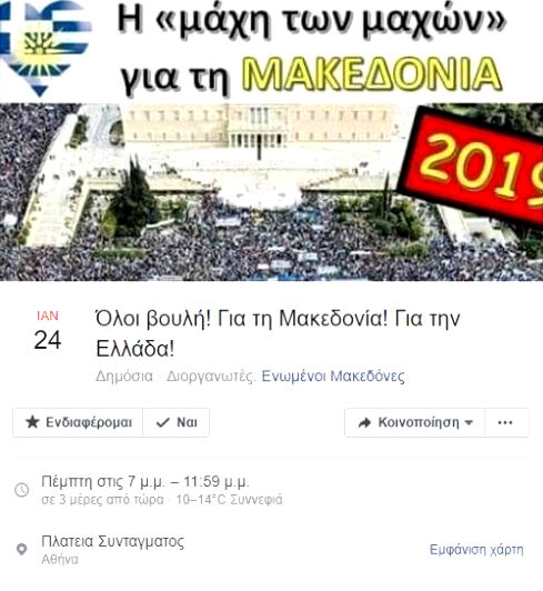 «Η μεγάλη μέρα έφτασε! Όπως όλα δείχνουν την Πέμπτη 24.1.2019 τα μεσάνυχτα, η κατάπτυστη συμφωνία των λιμνών θα πάει προς ψήφιση στην ολομέλεια της βουλής! ΟΛΟΙ οι Έλληνες πατριώτες δίνουμε ΔΥΝΑΜΙΚΑ το παρόν έξω από το κτίριο του κοινοβουλίου εκείνη τη νύχτα για να πούμε το νέο μεγάλο ΟΧΙ! Κατεβαίνουμε από όλη τη χώρα, με κάθε τρόπο, με κάθε μέσο! Σταματάμε την προδοσία! Θα είμαστε ΟΛΟΙ ΕΚΕΙ! Υ.Γ: Σε περίπτωση αλλαγής μέρας, όπως και να’χει θα είμαστε την ημέρα της ψήφισης εκεί! ΟΤΑΝ ΠΡΕΠΕΙ! ΕΚΕΙ ΠΟΥ ΠΡΕΠΕΙ! ΟΠΩΣ ΠΡΕΠΕΙ!».