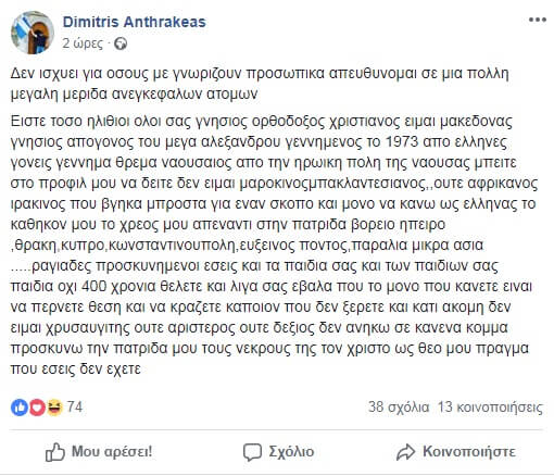 Στον προσωπικό του λογαριασμό στο facebook έγραψε μεταξύ άλλων: “Απευθύνομαι σε μεγάλη μερίδα ανεγκέφαλων ατόμων. Είστε τόσο ηλίθιοι όλοι σας! Γνήσιος Χριστιανός Ορθόδοξος είμαι, Μακεδόνας γνήσιος απόγονος του Μεγάλου Αλεξάνδρου, γεννημένος το 1973 από Έλληνες γονείς γέννημα θρέμμα Ναουσαίος… δεν είμαι Μαροκινός, Μπαγκλαντεσιανός, ούτε Αφρικανός… Ραγιάδες προσκυνημένοι εσείς και τα παιδιά σας και των παιδιώ σας παιδιά, όχι 400 χρόνια θέλετε, και λίγα σας έβαλα, που το μόνο που κάνετε είναι να παίρνετε θέση και να κράζετε κάποιον που δεν ξέρετε. Και κάτι ακόμη: δεν είμαι χρυσαυγίτης, ούτε αριστερός, ούτε δεξιός. Δεν ανήκω σε κανένα κόμμα, προσκυνώ την πατρίδα μου…”.