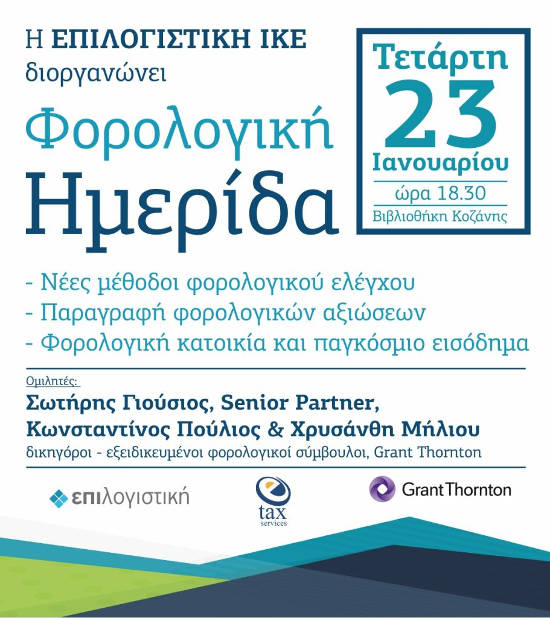 Η ΕΠΙ ΛΟΓΙΣΤΙΚΗ σας προσκαλεί στην Ημερίδα που διοργανώνει σε συνεργασία με την Grant Thornton την Τετάρτη 23 Ιανουαρίου και ώρα 18.30 στη Βιβλιοθήκη Κοζάνης με θέμα: