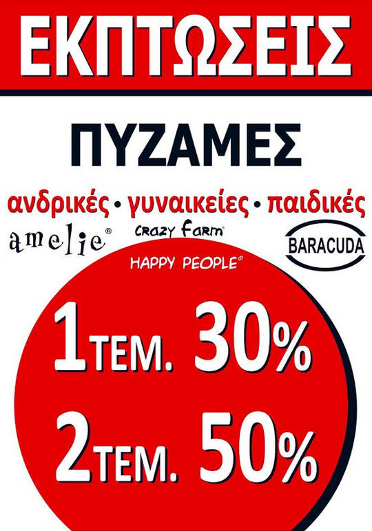 Επωφεληθείτε της μεγάλης προσφοράς στο Πολυκατάστημα Δραγατσίκας στην Κοζάνη και αποκτήστε τις αγαπημένες σας επώνυμες πυτζάμες crazy farm, amelie και baracuda με έκπτωση 30% για την αγορά ενός τεμαχίου και 50% για την αγορά 2 τεμαχίων.