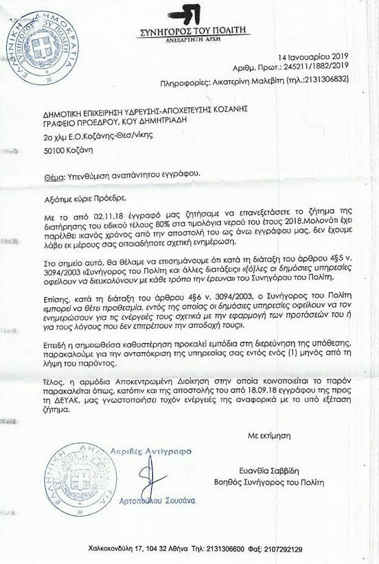 Έπειτα από την προσφυγή που έκανε ο δημοσιογράφος Μιχάλης Αγραφιώτης στο Συνήγορο του Πολίτη σχετικά με την κατάργηση του ειδικού τέλους 80% στους λογαριασμούς νερού της ΔΕΥΑΚ, αλλά και τον χαρακτηρισμό ως «Αμφίβολης Νομιμότητας» του τέλους από την πλευρά της ανεξάρτητης αρχής, η ΔΕΥΑΚ είχε την υποχρέωση να απαντήσει εγγράφως.