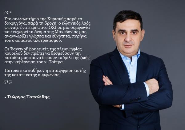 Πατριωτικό καθήκον η καταψήφιση αυτής της κατάπτυστης συμφωνίας που εκχωρεί το όνομα της Μακεδονίας μας, αναγνωρίζει γλώσσα και εθνότητα, πυρήνα του σκοπιανού αλυτρωτισμού και υποθηκεύει το μέλλον του τόπου μας και των επόμενων γενεών.