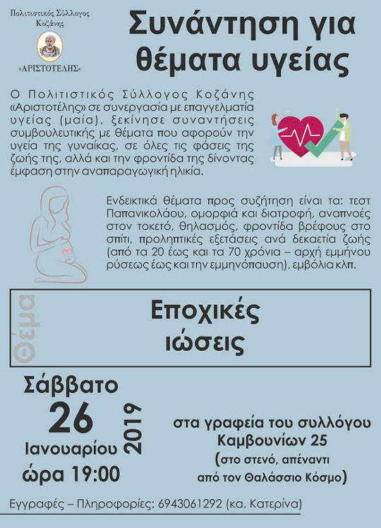 Ο Πολιτιστικός Σύλλογος Κοζάνης «Αριστοτέλης» συνεχίζει τις συναντήσεις συμβουλευτικής, με επαγγελματία υγείας (μαία), με θέματα που αφορούν την υγεία της γυναίκας, σε όλες τις φάσεις της ζωής της, αλλά και την φροντίδα της δίνοντας έμφαση στην αναπαραγωγική ηλικία.