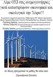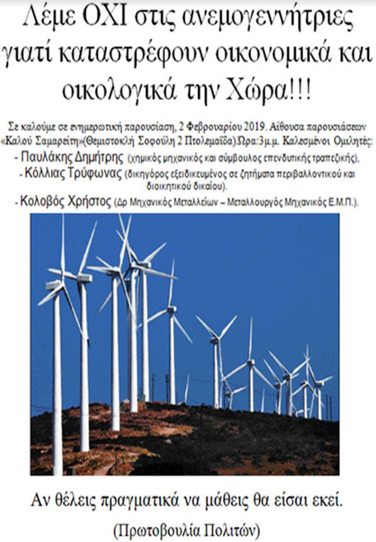 Το Σάββατο 2/2/2019 στις 3:00μμ θα γίνει στην Πτολεμαΐδα ενημερωτική εκδήλωση για τα αιολικά, στην αίθουσα «Καλού Σαμαρείτη» (Θεμιστ. Σοφούλη 2).