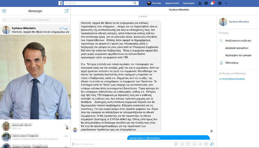 Η συνομιλία του Κυριάκου Μητσοτάκη μέσω fb με πολίτη της Κοζάνης και συγκεκριμένα με τον Παντελή Καπλάνογλου για το ζήτημα της Συμφωνίας των Πρεσπών.