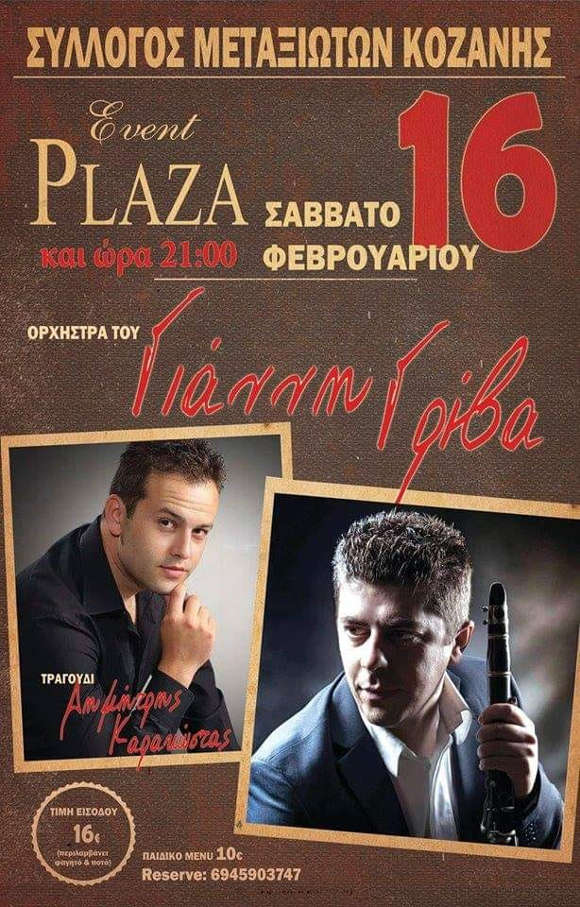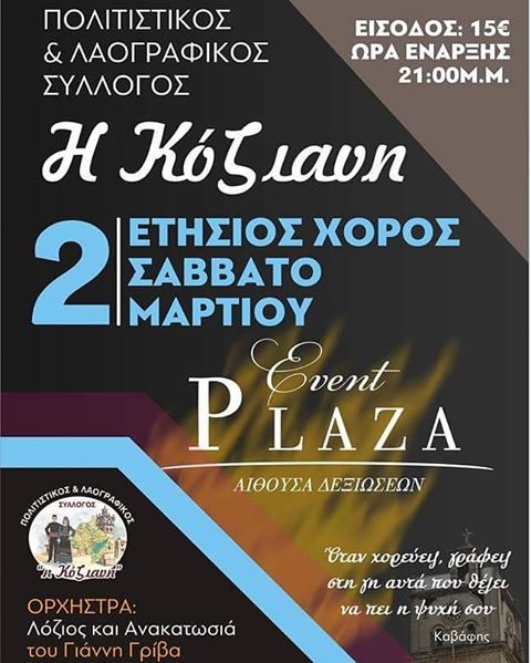 Το Σάββατο 16 Φεβρουαρίου 2019 και ώρα 21:00, ο Σ.Μ.Κ Σύλλογος Μεταξιωτών Κοζάνης διοργανώνει τον ετήσιο χορό του στο κέντρο δεξιώσεων Event Plaza.