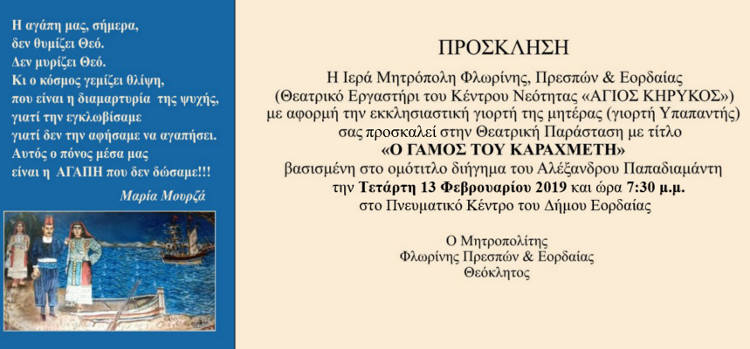 Πτολεμαΐδα 11/02/2019 Η θεατρική παράσταση «Ο γάμος του Καραχμέτη» στην Πτολεμαΐδα 0 Η θεατρική παράσταση «Ο γάμος του Καραχμέτη» στην Πτολεμαΐδα. Περισσότερες πληροφορίες στην παρακάτω πρόσκληση: