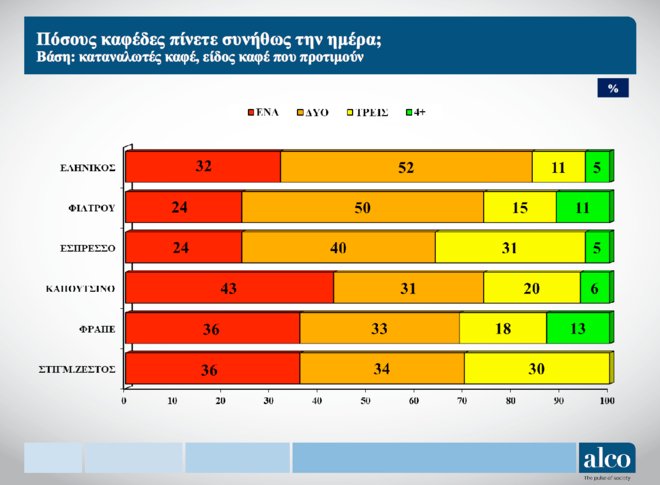 Οι άνδρες, οι μεγαλύτερες ηλικίες (35-55) και οι κάτοικοι της επαρχίας είναι οι ομάδες που σε ποσοστό 8% πίνουν τουλάχιστον τέσσερις καφέδες την ημέρα. Φίλτρου και εσπρέσσο είναι οι δύο κατηγορίες που οι περισσότεροι θα πιούν πάνω από μία φορά την ημέρα