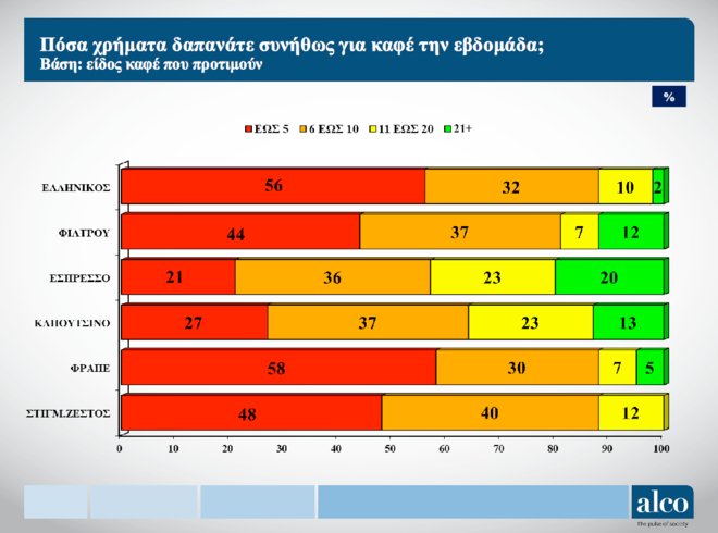 Η πιο δραστήρια ηλικιακή ομάδα (25-34) είναι αυτή που δαπανά τα περισσότερα χρήματα σε σχέση με τις υπόλοιπες ομάδες. Σε ποσοστό 15% θα διαθέσει πάνω από 21 ευρώ την εβδομάδα για το ρόφημα της. Σε ότι αφορά στα είδη τα λιγότερα ξοδεύουμε στον φραπέ (58% των ερωτηθέντων έως 6 ευρώ) και τα περισσότερα στον εσπρέσσο (20% πάνω από 21 ευρώ).