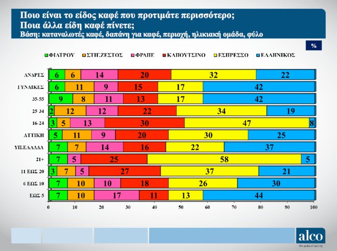 Ο ελληνικός καφές ως πρώτη (32%) ή επιπλέον επιλογή (29%) είναι ο μόνος που περνάει αθροιστικά το 50%. Αξίζει να σημειωθεί ότι στο σύνολο της αγοράς το ποσοστό είναι ακόμη μεγαλύτερο καθώς η έρευνα της ALCO πραγματοποιήθηκε έως την ηλίκια των 55.