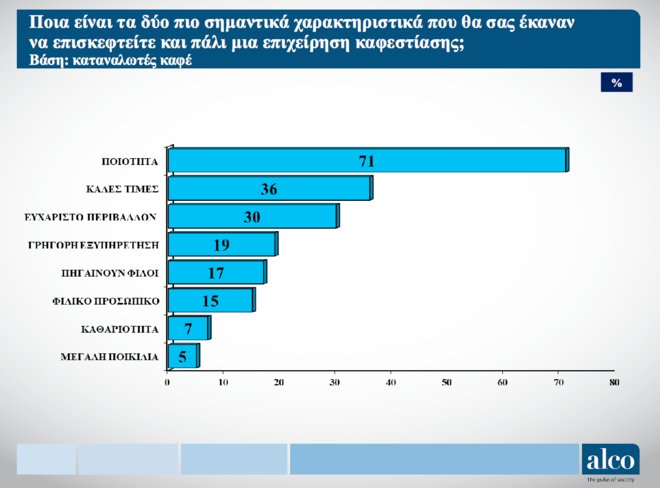 Αντίθετα η κακή ποιότητα (68%), οι ακριβές τιμές (36%), το κακό περιβάλλον (25%) και η έλλειψη καθαριότητας (21%) είναι οι βασικοί λόγοι που αποτρέπουν έναν καταναλωτή να επισκεφθεί πάλι μία επιχείρηση καφεστίασης.