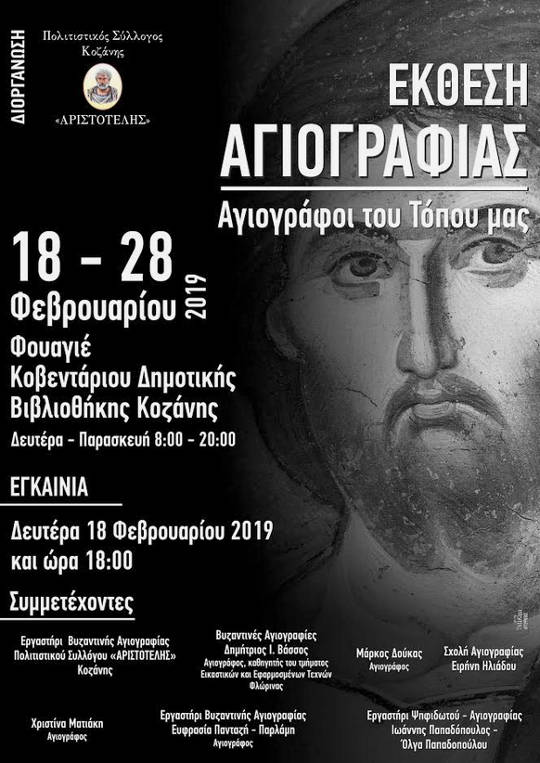 Το Εργαστήρι Αγιογραφίας του Πολιτιστικού Συλλόγου «ΑΡΙΣΤΟΤΕΛΗΣ» Κοζάνης, σε συνεργασία με καλλιτέχνες αγιογράφους της περιοχής μας, διοργανώνει Έκθεση Αγιογραφίας με θέμα «Αγιογράφοι του Τόπου μας».