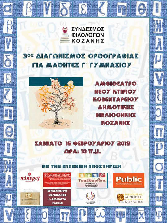 Ο Σύνδεσμος Φιλολόγων Κοζάνης διοργανώνει τον 3ο Διαγωνισμό Ορθογραφίας, με σκοπό την ευαισθητοποίηση όλων μας για την καλλιέργεια της ορθής χρήσης της Νέας Ελληνικής.