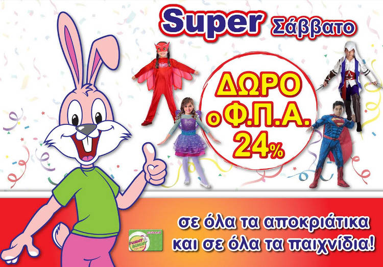 Μόνο αυτό το Σάββατο 16 Φεβρουαρίου, ψωνίστε όλα τα αποκριάτικα είδη και όλα τα παιχνίδια σας και κερδίστε το ΦΠΑ 24%.