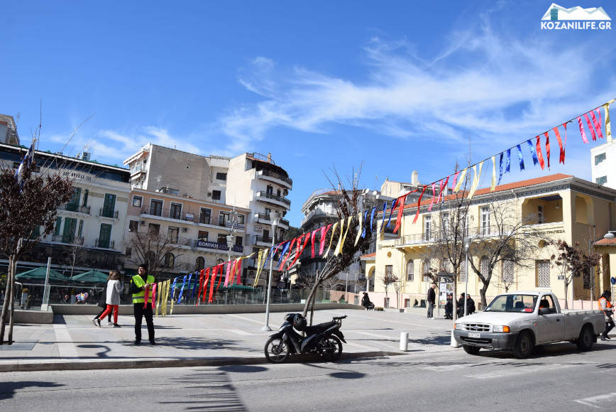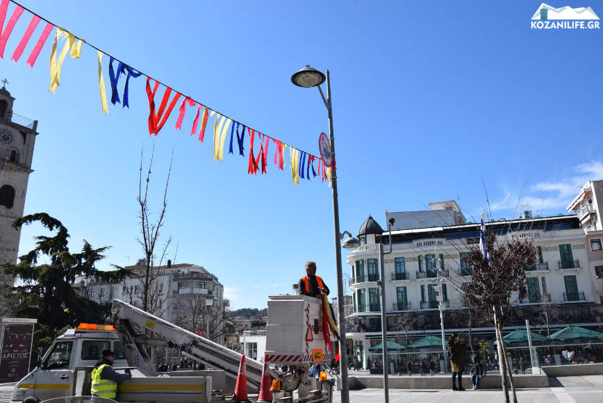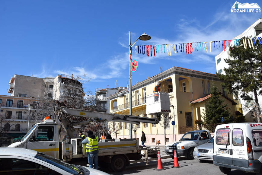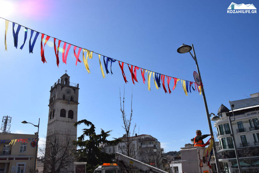 Δουλειά έπιασαν τα συνεργεία της τεχνικής υπηρεσίας του Δήμου Κοζάνης και οι άνθρωποι του ΟΑΠΝ το πρωί της Κυριακής 17 Φεβρουαρίου 2019, τοποθετώντας τα πρώτα αποκριάτικα στολίδια στο κέντρο της πόλης, επί της οδού Παύλου Μελά.