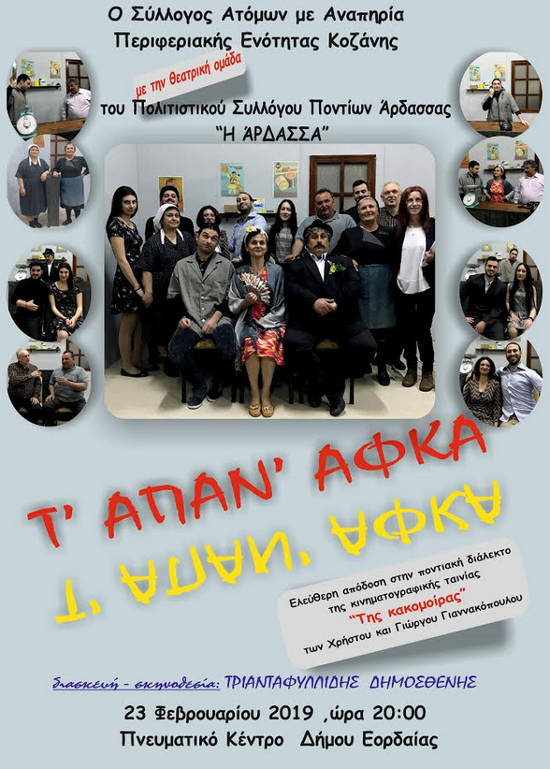Πτολεμαΐδα 18/02/2019 Η θεατρική παράσταση «Τ’Απάν’ Αφκα» στην Πτολεμαΐδα 0 Η θεατρική παράσταση «Τ’Απάν’ Αφκα» στην Πτολεμαΐδα. Περισσότερες πληροφορίες στην παρακάτω αφίσα: