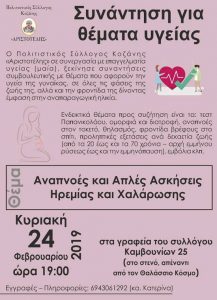 Η επόμενη συνάντηση, με θέμα “Αναπνοές και Απλές Ασκήσεις ηρεμίας και Χαλάρωσης”, θα πραγματοποιηθεί την Κυριακή24 Φεβρουαρίου 2019 και ώρα 19:00, στα γραφεία του συλλόγου, Καμβουνίων 25 (στο στενό απέναντι από τον Θαλάσσιο Κόσμο).