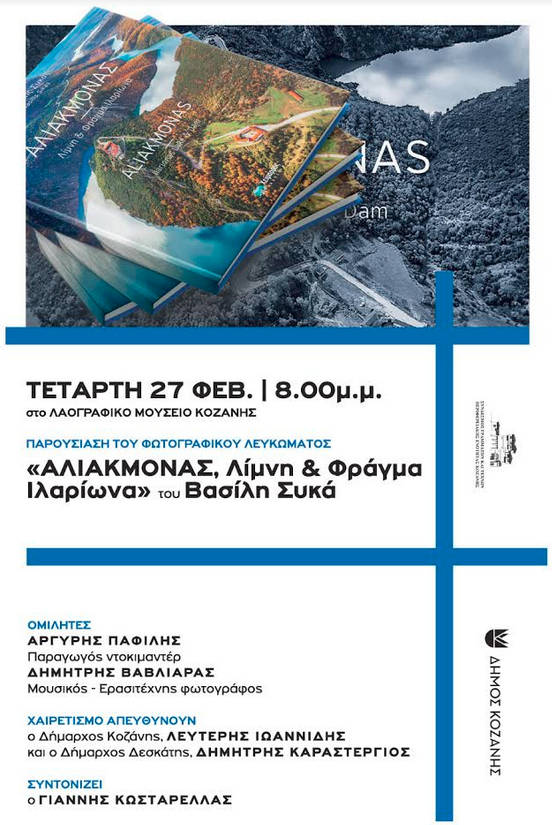 Σας προσκαλούμε στην παρουσίαση του Φωτογραφικού Λευκώματος «Αλιάκμονας, Λίμνη και Φράγμα Ιλαρίωνα» του Βασίλη Συκά, την Τετάρτη 27 Φεβρουαρίου και ώρα 8μ.μ. στο Λαογραφικό Μουσείο Κοζάνης.