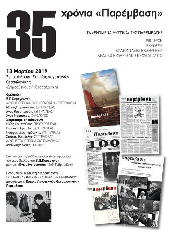 Στις 13 Μαρτίου 2019, ώρα 7 μ.μ., το περιοδικό «Παρέμβαση» πρόκειται να πραγματοποιήσει εκδήλωση για τα 35 χρόνια κυκλοφορίας του στην αίθουσα της Εταιρίας Λογοτεχνών Θεσσαλονίκης (Δημοσθένους 4).