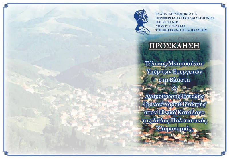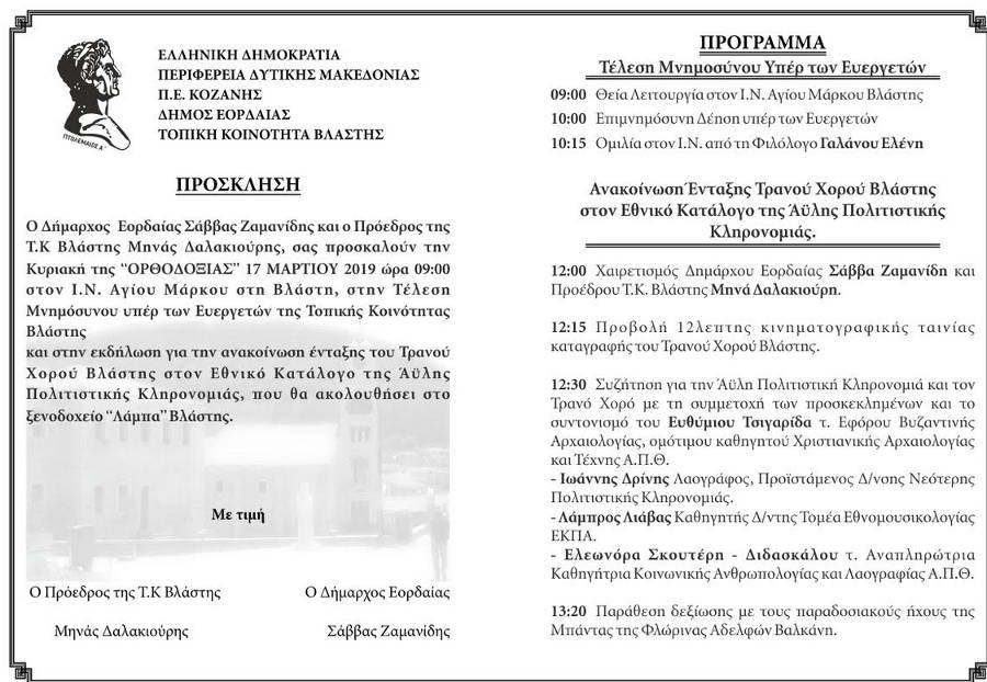 Πτολεμαΐδα 08/03/2019 Μνημόσυνο υπέρ των ευεργετών της Βλάστης και ένταξη του Τρανού Χορού στον Εθνικό Κατάλογο της Άυλης Πολιτιστικής Κληρονομιάς 0 Μνημόσυνο υπέρ των ευεργετών της Βλάστης και ένταξη του Τρανού Χορού στον Εθνικό Κατάλογο της Άυλης Πολιτιστικής Κληρονομιάς.