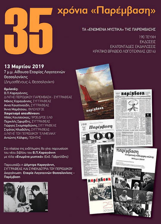 Στις 13 Μαρτίου 2019, ώρα 7 μ.μ., το περιοδικό «Παρέμβαση» πρόκειται να πραγματοποιήσει εκδήλωση για τα 35 χρόνια κυκλοφορίας του στην αίθουσα της Εταιρίας Λογοτεχνών Θεσσαλονίκης (Δημοσθένους 4).