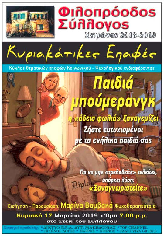 Ο Φιλοπρόοδος Σύλλογος σας προσκαλεί στις Κυριακάτικες Επαφές του Μαρτίου με θέμα: «Παιδιά μπούμερανγκ»: η «άδεια φωλιά» ξαναγεμίζει.