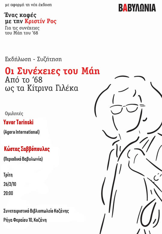 Με αφορμή το νέο βιβλίο της Βαβυλωνίας “Ένας Καφές με την Κριστίν Ρος για τις συνέχειες του Μάη του ‘68” σας προσκαλούμε στην εκδήλωση- ανοιχτή συζήτηση με τίτλο: “Οι Συνέχειες του Μάη: Από το ‘68 ως τα Κίτρινα Γιλέκα”.