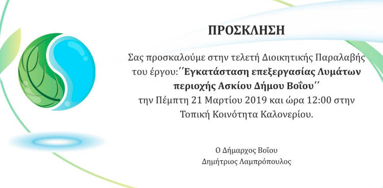 Βόιο 20/03/2019 Τελετή παραλαβής του έργου Εγκατάστασης επεξεργασίας Λυμάτων περιοχής Ασκίου του Δήμου Βοΐου 0 Τελετή παραλαβής του έργου Εγκατάστασης επεξεργασίας Λυμάτων περιοχής Ασκίου του Δήμου Βοΐου. Περισσότερες πληροφορίες στην παρακάτω πρόσκληση: