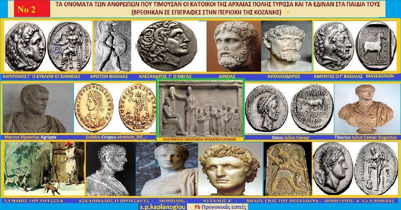 Αποκαλύψαμε πολλές αρχαίες επιγραφές σε προηγούμενες δημοσιεύσεις που βρέθηκαν στην πόλη της Κοζάνης και σε μικρή απόσταση από αυτή,,έχοντας υπ ‘όψιν και κάποιες άλλες που βρεθήκαν σε ακτίνα όχι μεγαλύτερη από 15 χλμ σε ευθεία γραμμή θα προσπαθήσουμε στην σημερινή ανάρτηση να δούμε τα ονόματα των κατοίκων της αρχαίας πόλης της Τύρισσα που βρισκόταν στην θέση της και θεούς που λάτρευαν, η διαδικασία που θα ακολουθήσουμε φαίνεται από το κολάζ των φωτογραφιών Νο1 που παραθέτουμε, επιλέγουμε την επιγραφή,απομονώνομε τα ονόματα των προσώπων ,τον θεό η τους θεούς που αναφέρεται , και στην συνέχεια θα αναζητήσουμε την βιογραφία τους και φωτογραφική απεικόνιση αν υπάρχει σε νόμισμα ,ανάγλυφο, προτομή ή οτιδήποτε άλλο υπάρχει, με τον τρόπο αυτό θα μάθουμε και τα πρότυπα των ανθρώπων που τιμούσαν που θα είναι μια σύνθεση συγχρόνως της ιστορίας και των γνώσεων τους για εκείνη την εποχη σε τυχόν εξέχουσες προσωπικότητες του καιρού τους και στην υπόλοιπη Ελλάδα.