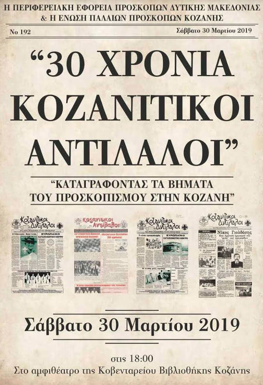 Η Περιφερειακή Εφορεία Πρόσκοπων Δυτικής Μακεδονίας και η Ένωση Παλαιών Προσκόπων Κοζάνης σας προσκαλούν στην εκδήλωση «Τριάντα χρόνια Κοζανιτικοι Αντίλαλοι- καταγράφοντας τα
