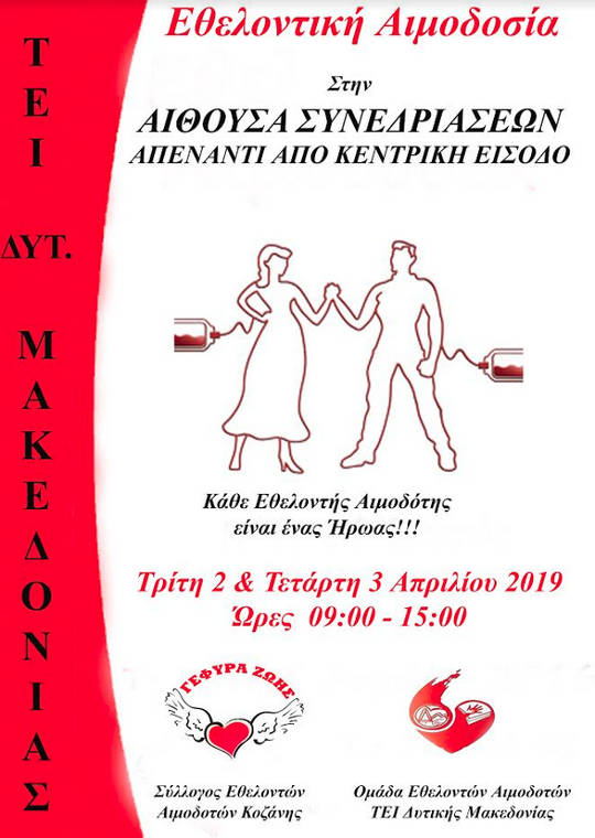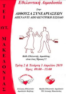Σας ενημερώνουμε επίσης, ότι την Πέμπτη, 11 Απριλίου 2019 και ώρες 14:30 -18:30 στο χώρο του Δημόσιου ΙΕΚ Κοζάνης (Λεωφ. Κων. Καραμανλή 26) θα πραγματοποιηθεί εθελοντική αιμοδοσία.