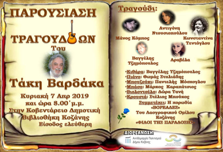 Την Κυριακή 7 Απριλίου στις 20:00 στη νέα Βιβλιοθήκη Κοζάνης θα μας παρουσιάσει 21 τραγούδια του, τους στίχους των οποίων του εμπιστεύτηκαν διάφοροι φίλοι και θα αποδώσουν εξαίρετοι Κοζανίτες μουσικοί και τραγουδιστές.