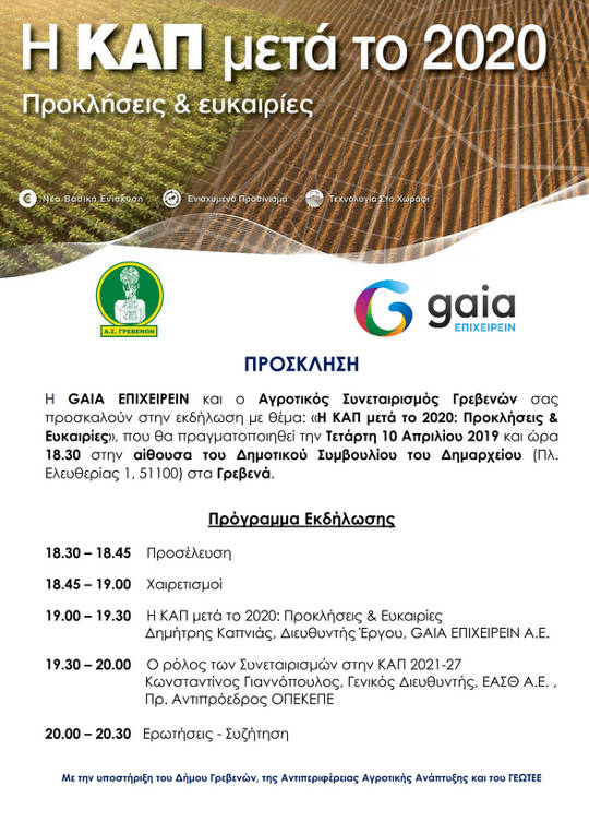 Ο Αγροτικός Συνεταιρισμός Γρεβενών και η GAIA ΕΠΙΧΕΙΡΕΙΝ σας προσκαλούν την Τετάρτη 10 Απριλίου 2019 και ώρα 18.30 στην αίθουσα του Δημοτικού Συμβουλίου του Δημαρχείου στα Γρεβενά, όπου θα πραγματοποιηθεί εκδήλωση με θέμα: «Η ΚΑΠ μετά το 2020: Προκλήσεις & Ευκαιρίες».