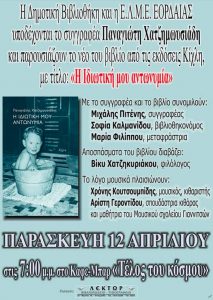 Η Δημοτική Βιβλιοθήκη Πτολεμαΐδας και η Ε.Λ.Μ.Ε. Εορδαίας, την Παρασκευή 12 Απριλίου στις 7.00μ.μ υποδέχονται το συγγραφέα Παναγιώτη Χατζημωυσιάδη και παρουσιάζουν το βιβλίο του: «H Ιδιωτική μου αντωνυμία» από τις εκδόσεις Κίχλη.